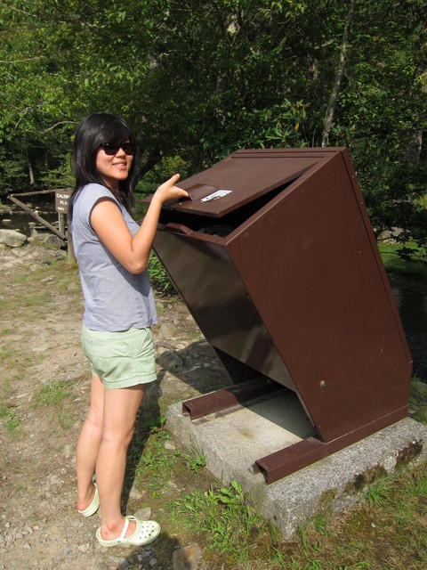 真人示範防熊垃圾箱。必須要手掌伸進去往回拉才打的開。